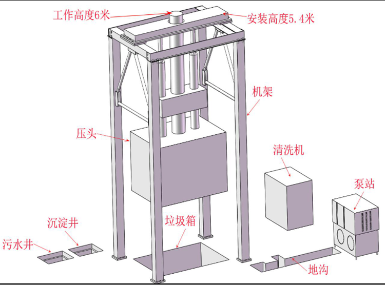 5.設(shè)有垃圾儲(chǔ)存箱,適合集裝箱式散裝垃圾運(yùn)輸車卸料,減少運(yùn)輸費(fèi)用。